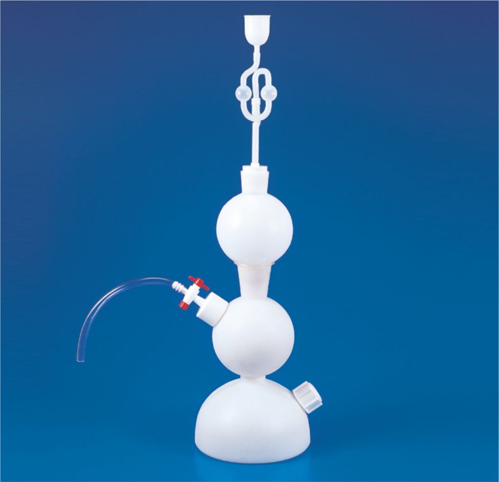 Polylab Kipp’s apparatus made of polyethylene has three main portions. The top portion is fitted with with a thistle funnel and a bulb structure through which dilute acid can be poured which reacts with a metal sulphide in the base of the apparatus. H.S gas then evolved collects in the middle dome from where it can be released through a leakproof stopcock fitted with a self lubricating PTFE plug. the base is provided with a residual outlet fitted with a cap for easy cleaning.