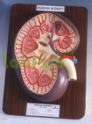 HUMAN KIDNEY L.S. 6003042 3 times enlarged, shows renal corpuscles,tubules,medulla.calyx system and pelvis as well as blood vessels and upper portion of ureter. On board,with key card.