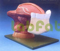 Enlarged model, dissectable in 2 parts, with detachable teeth of lower jaw, on base, with key card. larged 4 to 5 times, Shows outer,middle and inner ear.Removable auditory ossicles and labyrinth with cochlea and vestibulocochlear nerve.On base, with key card.