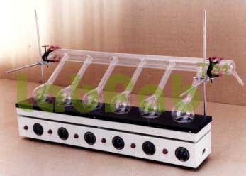 Complete with heating box and fume duct. The 500 watts heaters 6 inches apart having individual on/off switches and energy regulator. The height of the side stand with clamps provided, is adjustable to accommodate KJELDHAL flasks of 300 ml., 500 ml or 800 ml. Without glass parts but with fume duct. a) Unit of 3 test with ON/OFF switches. ( Heater Type) b) Unit of 3 test with ON/OFF switches. ( Mantle Type) c) Unit of 6 test with ON/OFF switches. ( Heater Type) d) Unit of 3 test with ON/OFF switches. ( Mantle Type) Note : 1. Sunvic Energy Regulator can be fitted at extra cost. 2. Fume Duct made of lead or corning glass at extra cost.