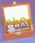 Chrome plated brass weights, in polished velvet lined wooden case, with hinged lid. Divided compartments with dust proof cover holds nickel-silver and aluminium fractions. With chrome plated brass forceps. Accuracy plus-minus 5mg